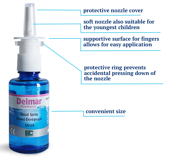 Delmar Panthenol nasal spray is a seawater solution with calcium D-pantothenate. It is intended for the damaged nasal mucosa with impaired physiological function and irritation.